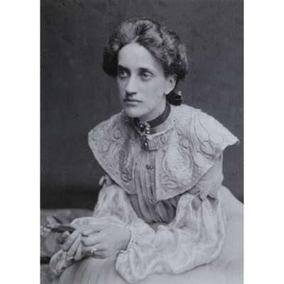 Note: An inspiring artist, teacher and women’s rights activist, Ann Macbeth’s embroideries continue to charm and captivate those who set their eyes upon them. Skilfully executed, her work typically features young female figures encased within an array of stylised roundels and openwork banding. However, as a teacher at the School of Art, she continued to uphold Jessie Newbery’s views and encouraged students to explore women’s fashion and artistic dress. This rare surviving example of a collar, very likely worn by her for a portrait taken in 1900, captures the organic essence and vibrancy of the Glasgow style.