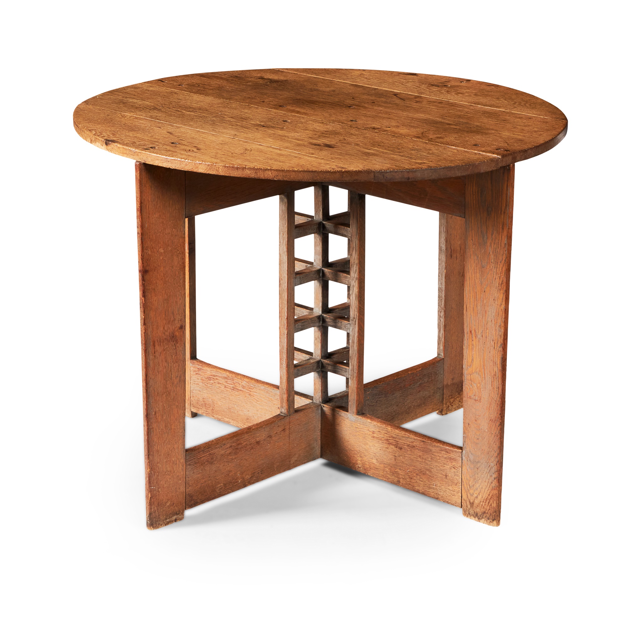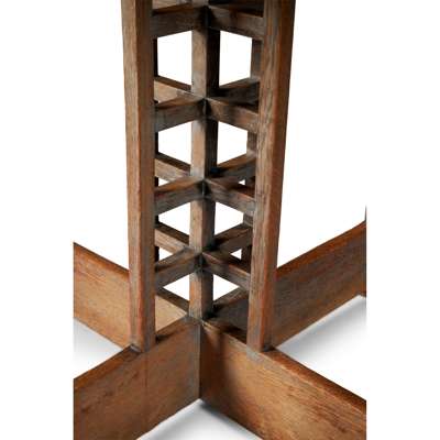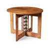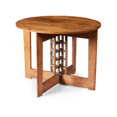 Note: This table formed the base of a writing table made by Frances Smith for the Ladies' Rest Room at Miss Cranston's Ingram Street Tearoom in 1909. The Rest Room formed one of two new adjacent rooms created by Mackintosh for the Ingram Street Tea Rooms: The Oval Room and the Ladies Rest Room. This latter room was dark stained and panelled with recesses for couches and other furniture. The fireplace was surrounded by gold mosaic tiles and open columns supported the mezzanine of the Oval Room above. The desk originally had a superstructure with dividers which allowed for four people to sit at the desk at any time and may in any case have been removable. Although the original layout of the room is not known, it may be that the circular writing desk offered here sat in the bow window next to the fireplace at one end of the room.