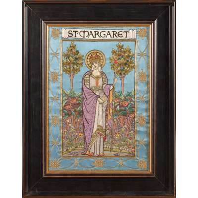 coloured silks on a blue silk ground with gilt thread embellishment, bears inscription ST. MARGARET