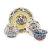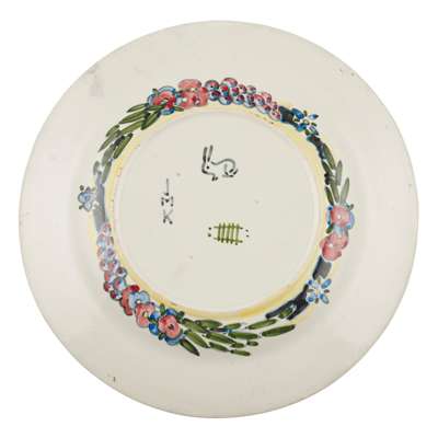painted earthenware, comprising a VASE, 11.5cm high; a POT & COVER, 10cm high; a PLATE, 24.5cm diameter; and a SAUCER, 13.8cm diameter, all with painted initials JMK and Greengate and Rabbit cyphers