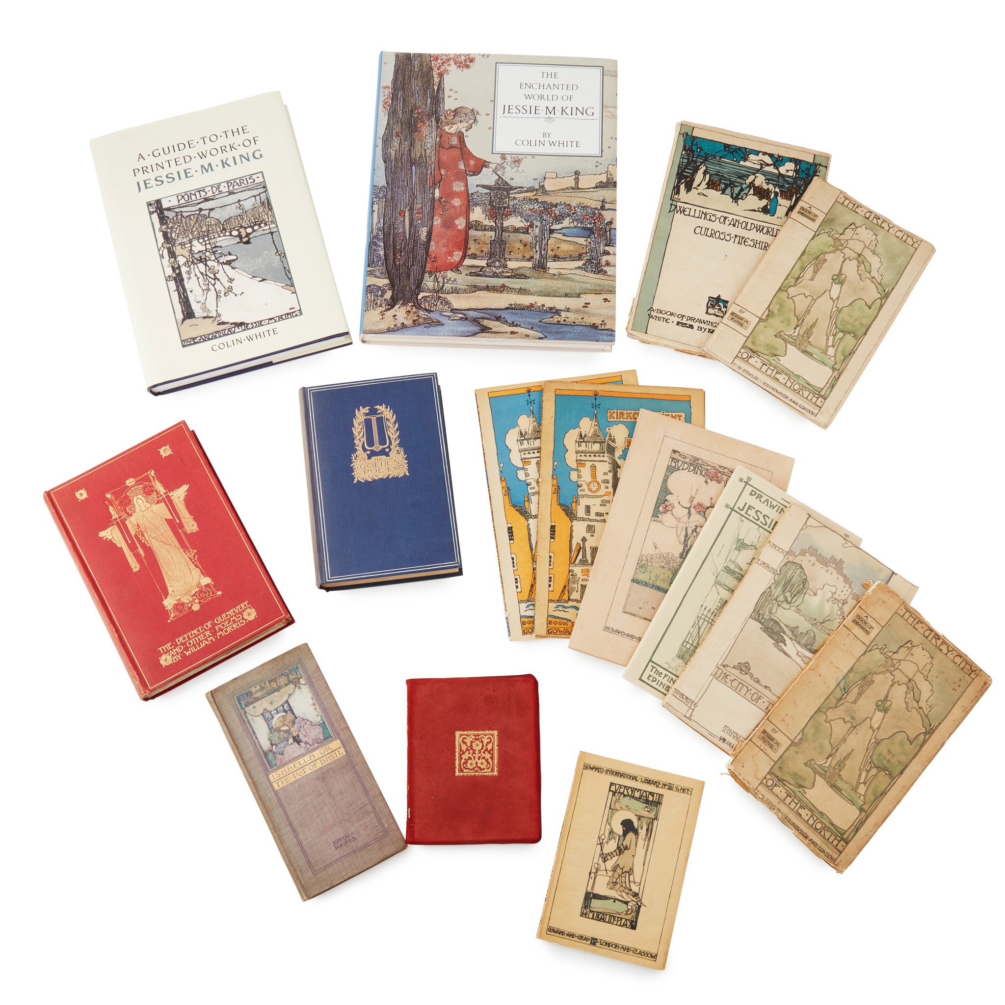 to include EIGHT SOFT-BACKED BOOKS, CIRCA 1909, pub. T.N. Foulis THE GREY CITY; THE CITY OF THE WEST; THE GREY CITY; DWELLINGS OF AN OLD WORLD TOWN; and pub. Gowans and Gray, EVERYMAN; KIRKCUDBRIGHT A ROYAL BURGH (2 copies); THE DEFENCE OF GUENEVERE & OTHER POEMS BY WILLIAM MORRIS, orig. dec. red cloth gilt. 1904; RUBAIYAT OF OMAR KHAYYAM, tooled suede binding, Routledge, 1903; ISABELLA OR THE POT OF BASIL, pub. T.N. Foulis, c. 1910; POEMS OF SPENSER, Caxton Publishing Co., c. 1907; DRAWINGS OF PARIS BY JESSIE M. KING, pub. The Fine Art Society, 1977; THE ENCHANTED WORLDS OF JESSIE M. KING BY COLIN WHITE, pub. Canongate 1989; and A GUIDE TO THE PRINTED WORK OF JESSIE M. KING BY COLIN WHITE, pub. The British Library 2007