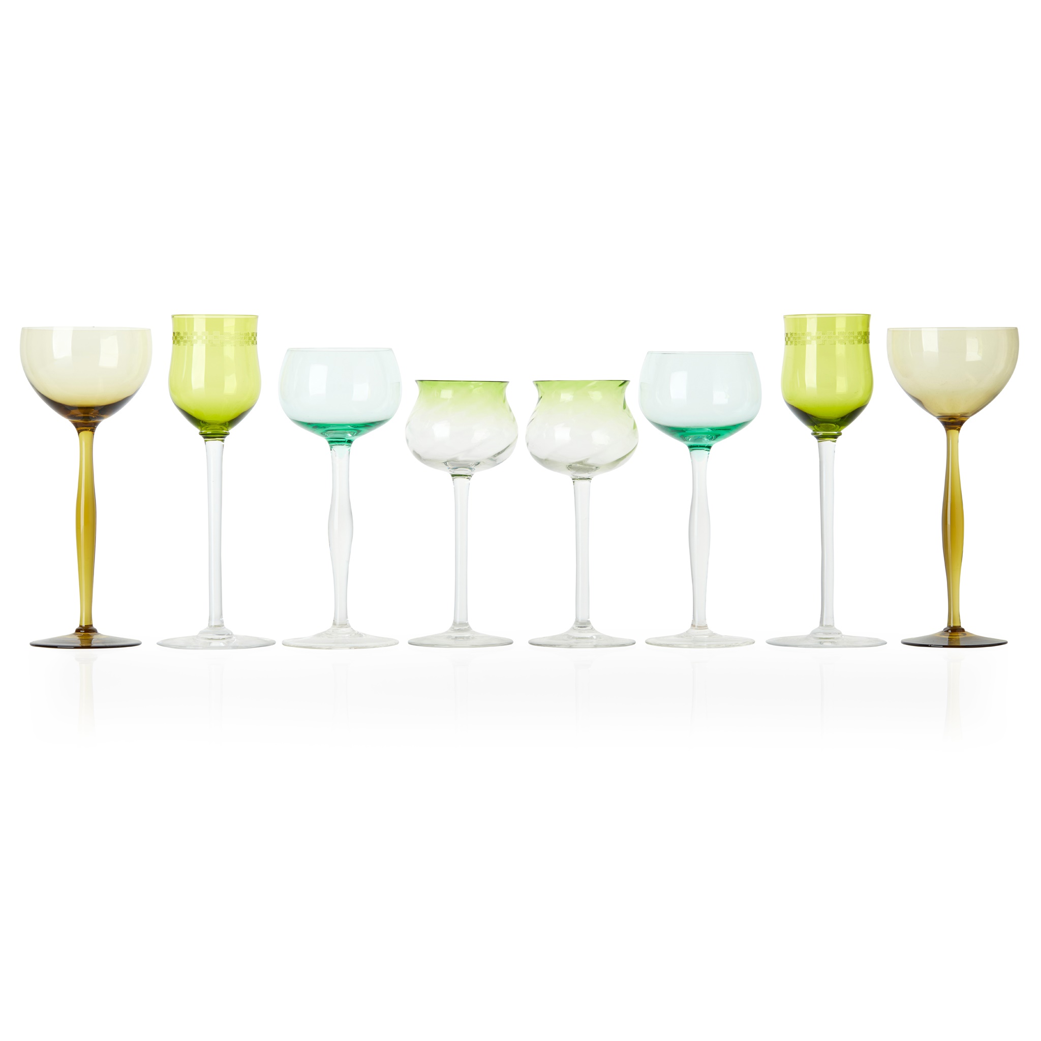 to include FOUR HOCK GLASSES, olive green glass, 19.2cm high; SIX HOCK GLASSES, textured and clear glass, green glass rim, 16.1cm high; SIX WINE GLASSES, etched green glass, clear glass, 20cm high; and FOUR HOCK GLASSES, pale green and clear glass, 17.5cm high
