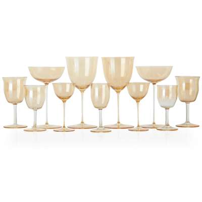 hand-blown amber glass, comprising FIVE WATER GOBLETS, 18cm high; FIVE CHAMPAGNE COUPES, 15.5cm high and SIX SHERRY GLASSES, 11.8cm high; together with a GROUP OF GLASSES IN THE MANNER OF JOSEPH HOFFMANN, comprising SIX WINE GLASSES, 11.5cm high; FOUR WINE GLASSES, 13cm high; and a FURTHER WINE GLASS, 12cm high