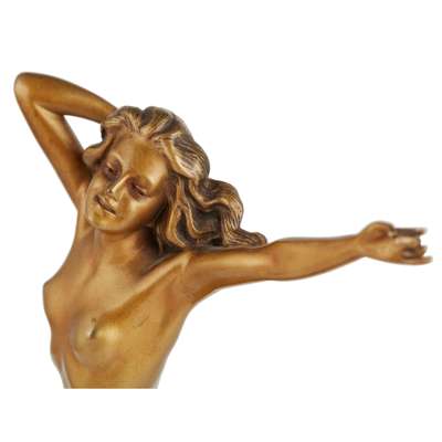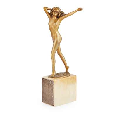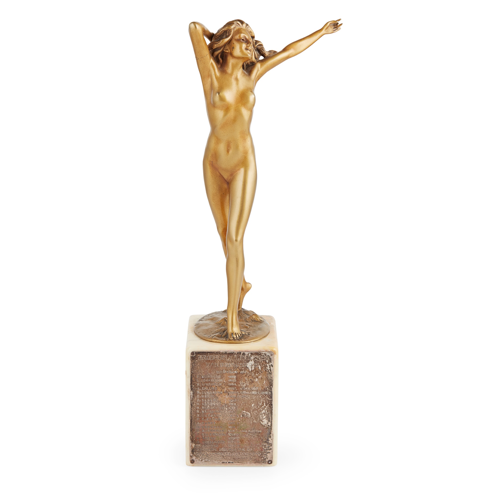 gilt-bronze, applied white metal trophy plaque, raised on a marble base, signed in the bronze PRF. POERTZEL