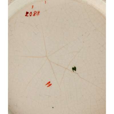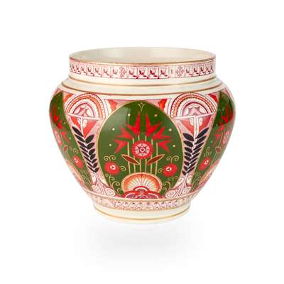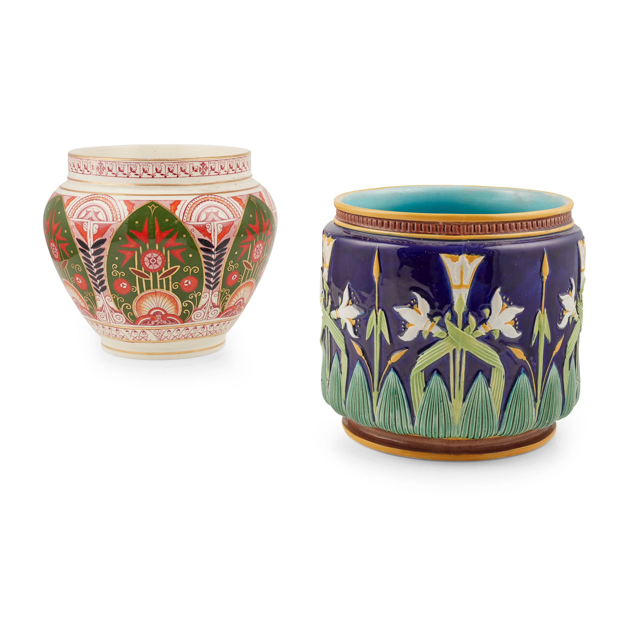 printed and glazed earthenware, with gilt embellishments, painted marks under base 2088, 19cm high; together with a MAJOLICA JARDINIÈRE BY GEORGE JONES, STOKE-ON-TRENT, tin-glazed earthenware, indistinct impressed marks, painted mark 3379/ 11, 17.5cm high