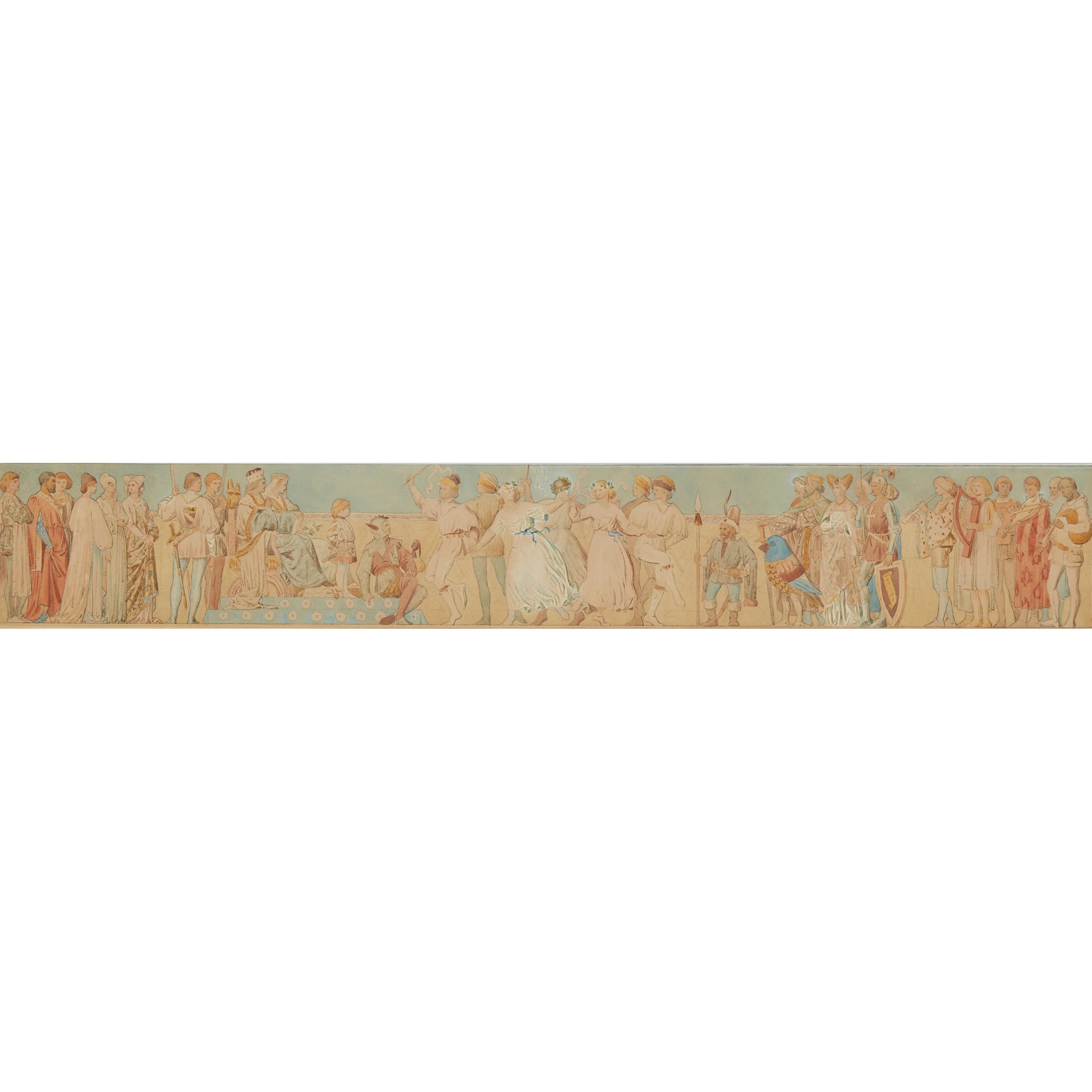 Note: Influenced by the Pre-Raphaelites, Henry Stacy Marks trained at the Royal Academy in 1851 before studying in Paris the following year. Much of his early works focus on Shakespearean and medieval subjects. These works proved popular with many patrons. In the 1860s he undertook work for William Burges, Minton, stained glass manufacturers Clayton & Bell and the artist Lawrence Alma Tadema. During this time, he was also approached by the Gaiety Theatre in London to produce a frieze for the Proscenium Arch. The Theatre began as a music hall but became known for hosting pantomime and musical burlesque performances. From the late 1860s, the venue played an essential role in the development of modern musical comedy, and Mark’s playful and charming compositions were a setting for spectators to marvel at.