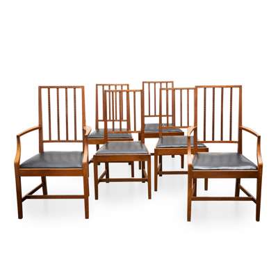 Note: The original design drawings for the side chairs in this set, signed by Ernest Gimson and dated Dec 31st 1908 and 1909, are held in the Cheltenham Museum Archive (The Wilson) (1941.222.160 and 1941.222.453).