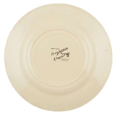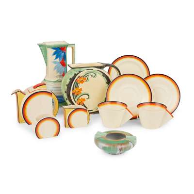painted and glazed earthenware, comprising a TEAPOT & COVER, 12cm high; TWO CUPS & SAUCERS, a PLATE; a MILK JUG; and a SUGAR BOWL, each printed BIZARRE BY CLARICE CLIFF; together with THREE HAND-PAINTED POTTERY WARES, 1930's