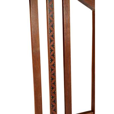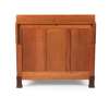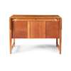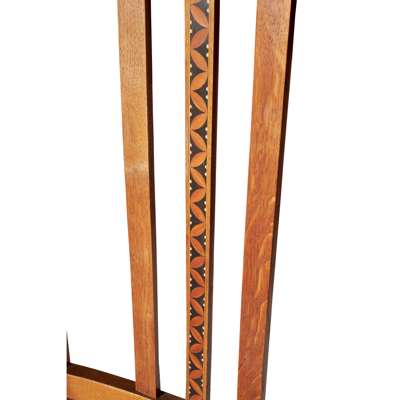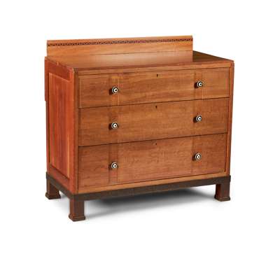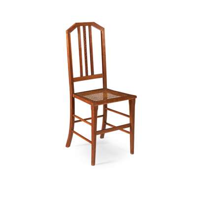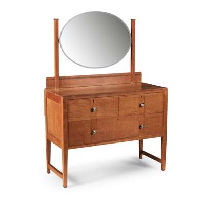 inlaid oak, with Bakelite handles with corresponding inlay, comprising a CHEST OF DRAWERS, 91cm wide, 87cm high, 47cm deep; a CHAIR, with caned seat, 39cm wide, 96cm high, 36cm deep; and a DRESSING TABLE AND MIRROR, 98cm wide, 136cm high, 45cm deep
