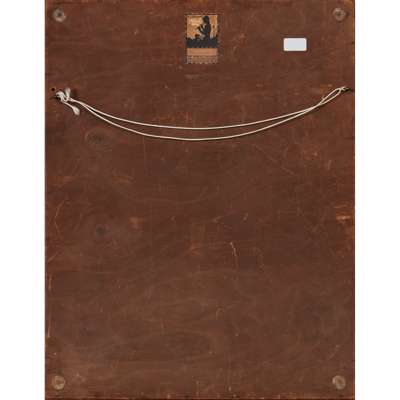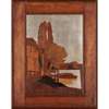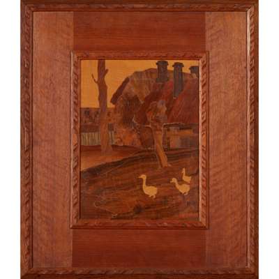 to include 'RIVERSIDE', marquetry inlaid specimen woods, painted wood, within walnut frame, 68cm x 53cm; and 'THE DUCK POND', marquetry inlaid specimen woods within walnut frame, 44cm x 37cm, each with printed makers labels version with ink inscriptions