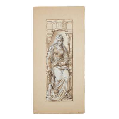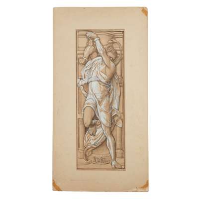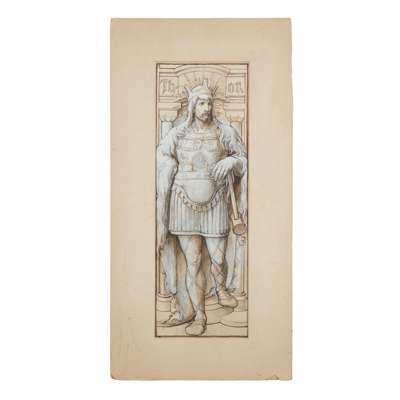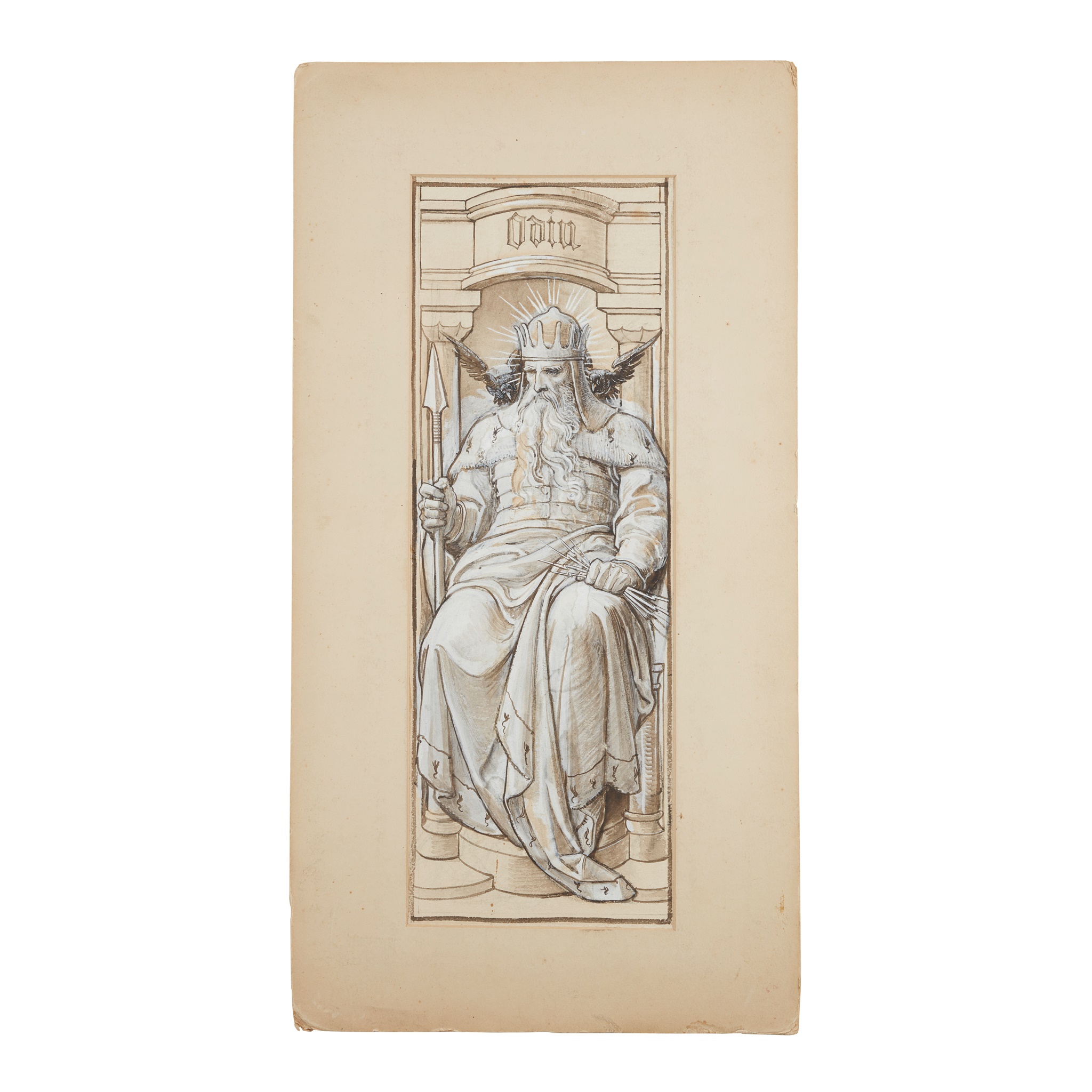 graphite, pen and wash, bodycolour, depicting Norse gods, bearing inscriptions THOR; LOKI; ODIN; and JÖRD, each within card mounts