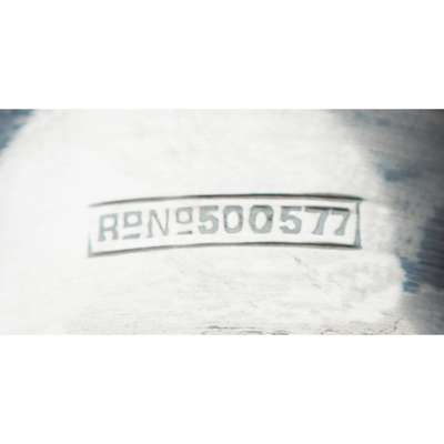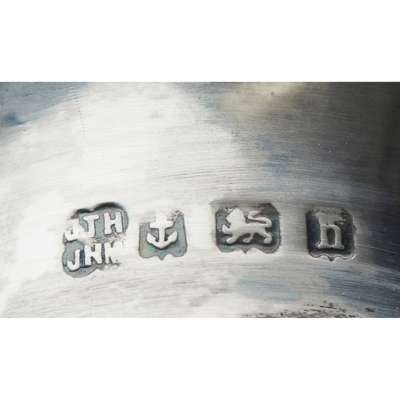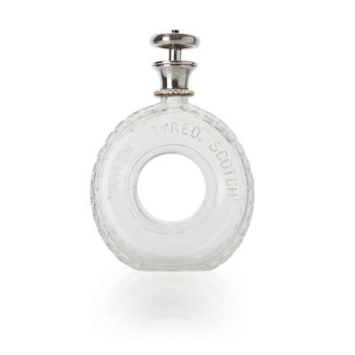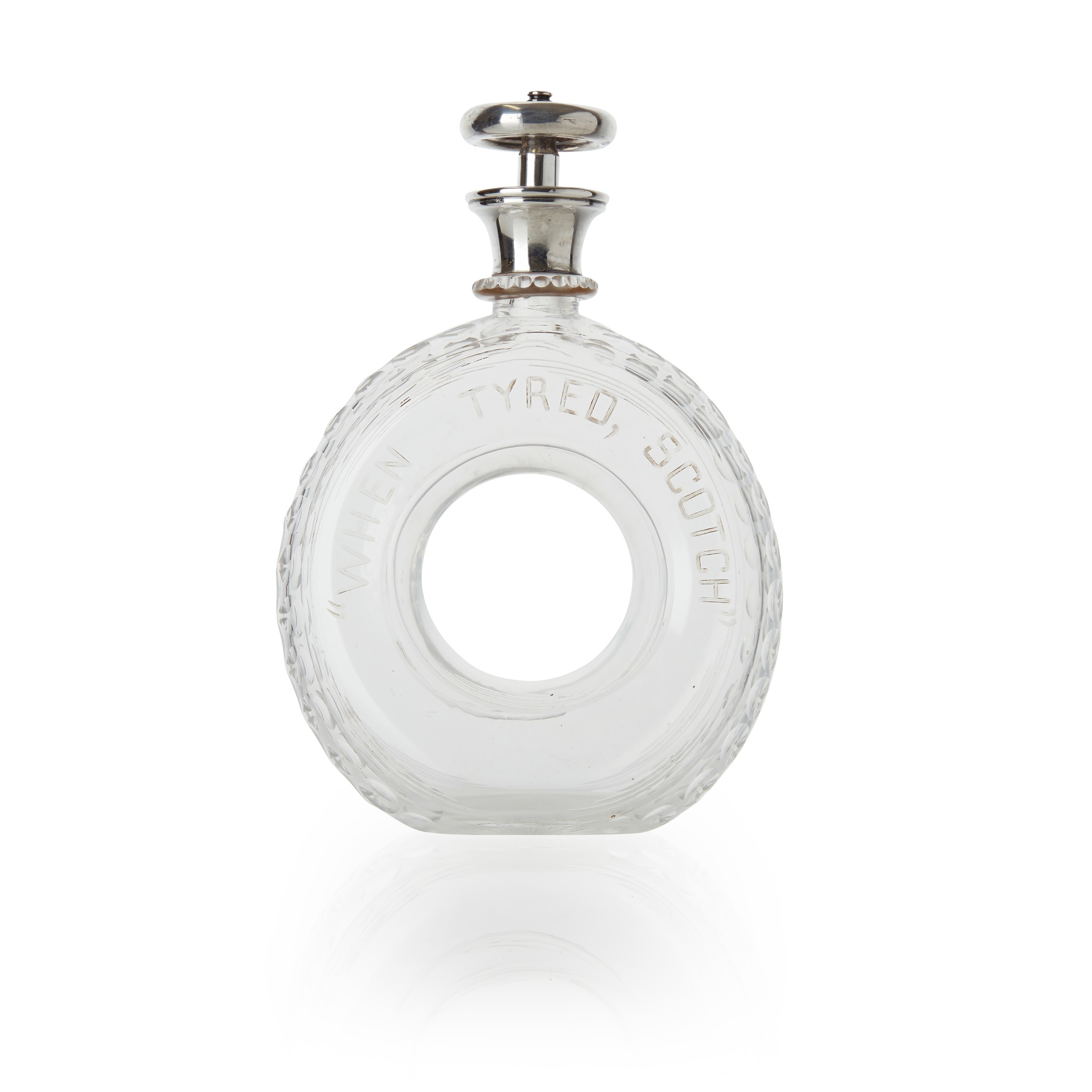 etched and cut glass, with silver 'wheel' stopper and collar, etched inscription to glass "WHEN TYRED, SCOTCH", stamped maker's marks, hallmarked Birmingham 1907, stamped registration no. 500577
