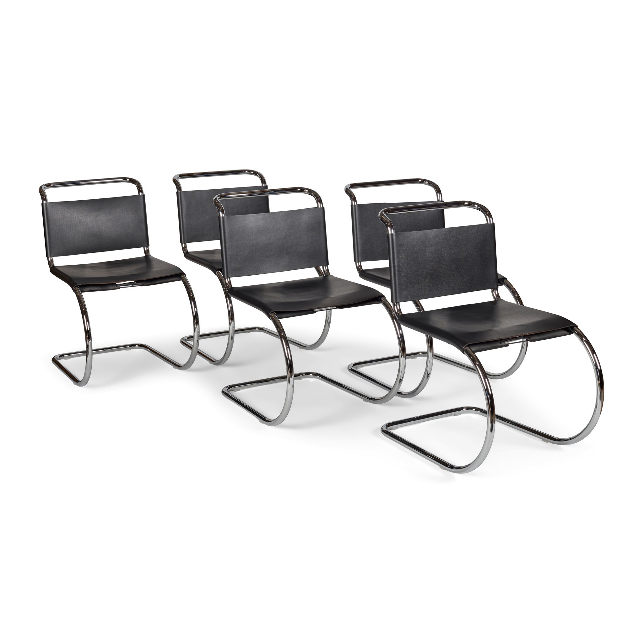 polished chrome, black cowhide upholstery, two with cast mark and signature KNOLL STUDIOS/ LUDWIG MIES VAN DER ROHE