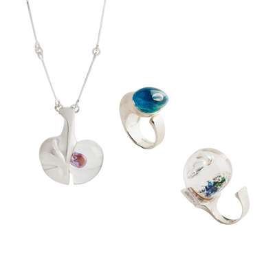 sterling silver, acrylic, stamped 925/ LAPPONIA/ Y7, pendant 5cm tall, chain 62cm long; also TWO LAPPONIA RINGS BY BJÖRN WECKSTRÖM, CIRCA 1974, sterling silver, acrylic, each stamped 925/ LAPPONIA, one stamped V7, the other Y8