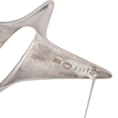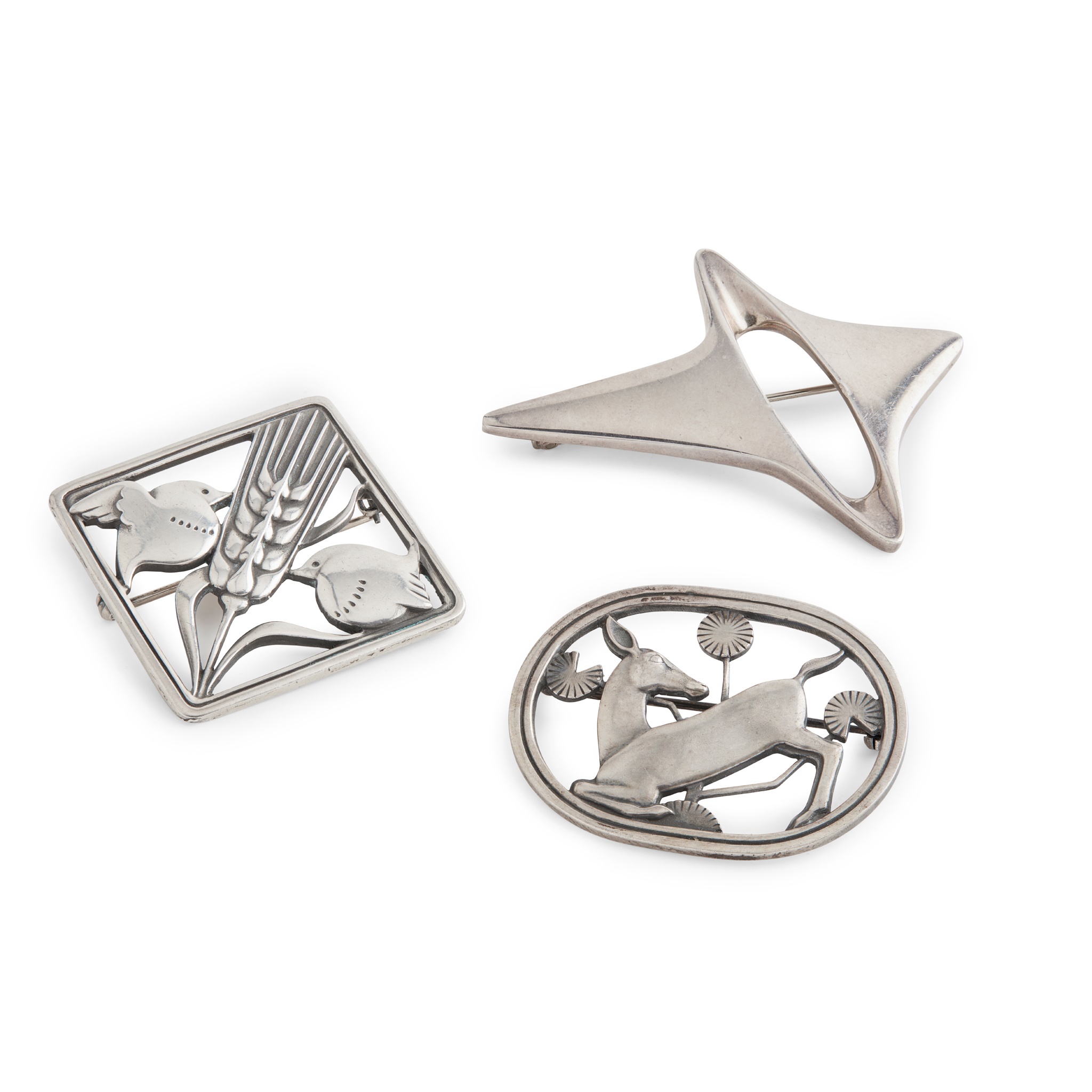 sterling silver, stamped GJ/ STERLING/ DENMARK/ 250, 3.6cm across; HENNING KOPPEL (1918-1981) FOR GEORG JENSEN BROOCH, sterling silver, stamped GEORG JENSEN/ 925S/ DENMARK/ 339, 6cm across; and a GEORG JENSEN 'KNEELING FAWN' BROOCH, sterling silver, stamped marks JG/ STERLING/ DENMARK/ 256, 4.6cm across