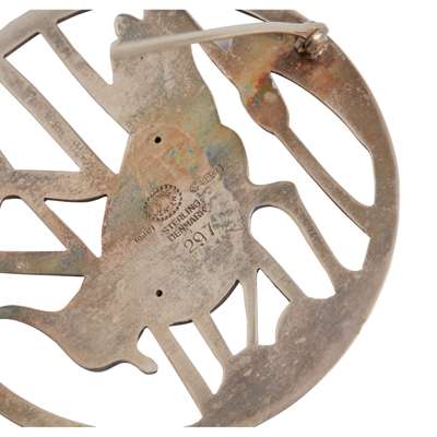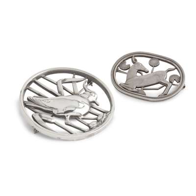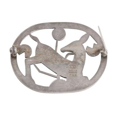 sterling silver, stamped marks GEORG JENSEN/ STERLING/ DENMARK/ 297, import marks for 1963, 5.5cm diameter; also a GEORG JENSEN 'KNEELING FAWN' BROOCH, sterling silver, stamped GEORG JENSEN/ STERLING/ DENMARK, 4.5cm across