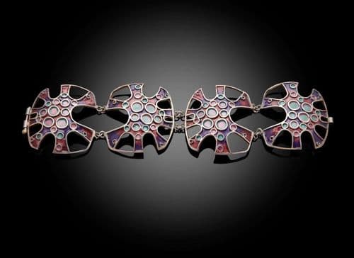 silver, enamel, stamped NG/ STERLING SILVER, hallmarked Edinburgh 1978, 4.1cm diameter; a 'CROSS SECTION PLANT STAMEN' SERIES BROOCH/PENDANT, silver, enamel, stamped NG, hallmarked Edinburgh 1970, 5.5cm diameter; a NORMAN GRANT 'HONESTY PLANT' SERIES BROOCH/PENDANT, silver, enamel, stamped NG, hallmarked Edinburgh 1972, 5.5cm diameter; and a PAIR OF 'PYRAMID' SERIES EARRINGS, white metal and enamel, unmarked, 5.5cm tall