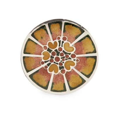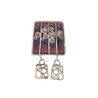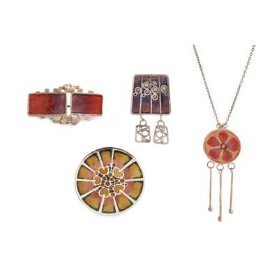 silver, enamel, stamped NG, hallmarked Edinburgh 1976, 4.1cm diameter; a NORMAN GRANT 'FROG SPAWN' SERIES BROOCH, silver, enamel, stamped NG, hallmarked Edinburgh 1973-4, 5.3cm tall; a NORMAN GRANT 'MEXICAN BLANKET' BROOCH, silver, enamel, stamped NG, hallmarked Edinburgh 1973-4, 4.8cm across; and a NORMAN GRANT 'FLORAL MOTIF' SERIES PENDANT NECKLACE, silver, enamel, stamped NG, hallmarked Edinburgh 1972, pendant 7cm tall
