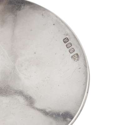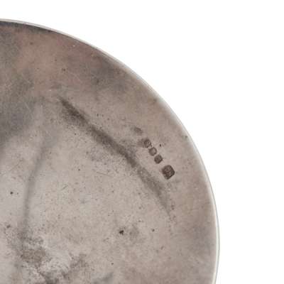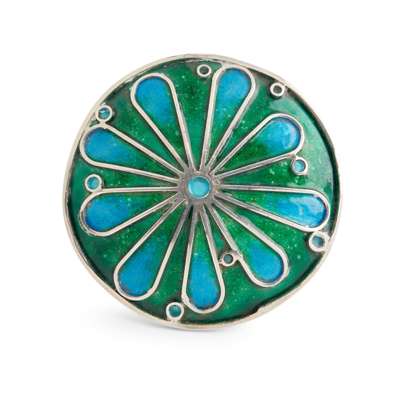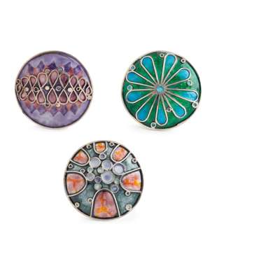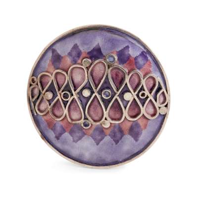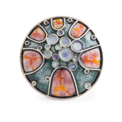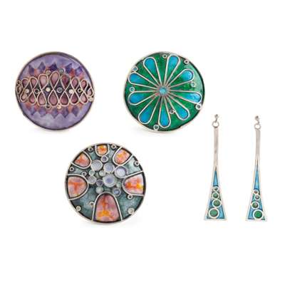 silver, enamel, stamped NG, hallmarked Edinburgh 1976, 5.5cm diameter; a NORMAN GRANT 'MICROSCOPIC PLANT CROSS SECTION' SERIES BROOCH, silver, enamel, stamped NG, hallmarked Edinburgh 1976, 5.5cm diameter; and a NORMAN GRANT 'STYLISED NINE PETAL FLOWERHEAD' SERIES BROOCH, silver, enamel, stamped NG, hallmarked Edinburgh 1976, 5.5cm diameter; and a PAIR OF EARRINGS, each stamped NG, hallmarked Edinburgh 1971, 5.5cm tall