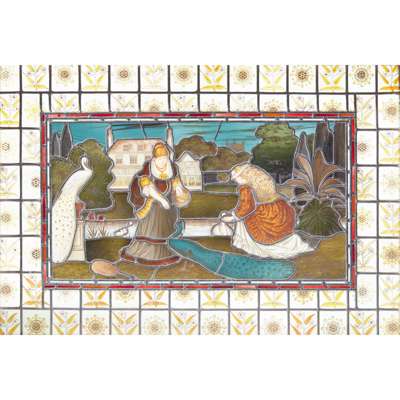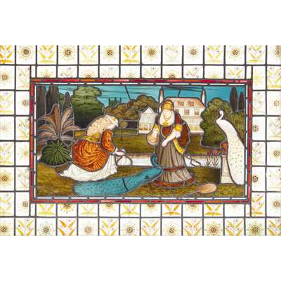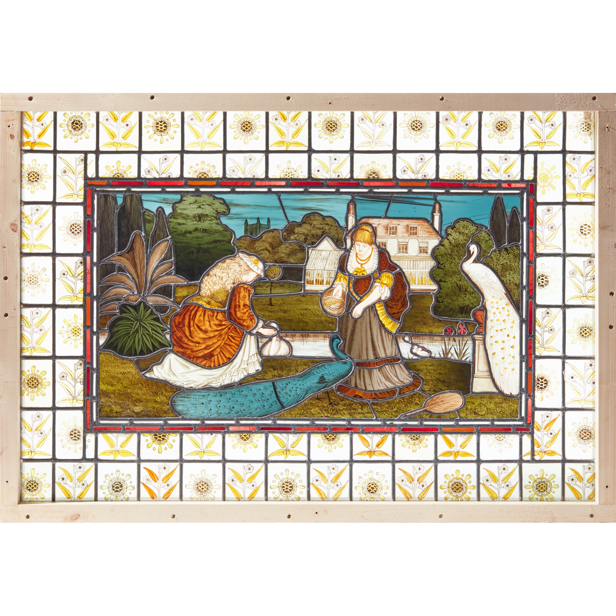 Note: The artist, designer, decorator and art dealer Daniel Cottier (1838-1891) is acclaimed for his creative exploitation of the building and decorating boom of the late 19th century and his entrepreneurial founding of an intercontinental business empire in response. Cottier was born and raised in Glasgow, the ‘second city’ of the British Empire, where he established a reputation as an accomplished stained glass designer and business owner and soon became one of Scotland’s most innovative decorators. Encouraged by his growing success, Cottier founded ‘Cottier & Co.’ in London in 1869 with one of its specialities being the design and manufacture of stained glass in churches, public buildings and private homes. In the following decade, Cottier’s glass palette was increasingly marked by the richer and darker colours associated with the Aesthetic Movement, of which he became a key exponent. The peacock, sunflower and lily became popular adornments of ‘The House Beautiful’ during this artistic period, and feature prominently in Cottier’s glass designs. In particular, the peacock became a prevailing icon of the Aesthetic movement for its colour and splendour which perfectly matched the movement’s goal to produce and experience “art for art’s sake”.