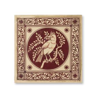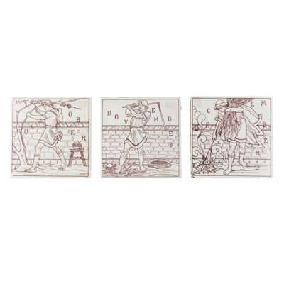 glazed earthenware, GROUP OF SIX MINTON, HOLLINS & CO. TILES: 'ALLEGORICAL OF THE SEASONS'15.2cm square; THREE CRAVEN DUNNILL 'MONTHS OF THE YEAR' TILES, 15.3cm square; a CAMPBELL BRICK & TILE CO. 'ZODIAC' TAURUS TILE, designed by Lewis F. Day, 15.3cm square; and a MINTON, HOLLINS & CO., TILE, decorated with a Cockatoo, 20.5cm square
