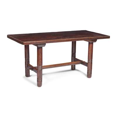 Note: The form of this table has similarities to the ‘Kelmscott’ table Philip Webb designed in circa 1875, which William Morris had in his study at Kelmscott House, Hammersmith, with its H form stretcher and turned legs. There is a watercolour by Mary A. Sloane ('May Morris in Tapestry Room at Kelmscott Manor', 1910-15), which depicts William Morris' daughter May editing the twenty-four volumes of Collected Works by William Morris at the Kelmscott table. The picture is held in the William Morris Gallery, Waltham Forest, London.