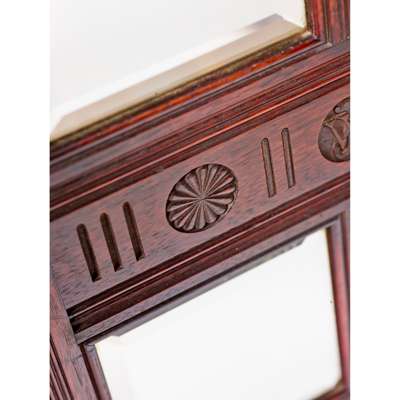 mahogany, clear glass, bevelled mirrored glass and brass fittings, abalone shell inlay, machine-embroidered fabric, embossed leather paper