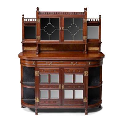 Note: During the 1870s Godwin designed a series of furniture for Collinson & Lock, which was then later redesigned for William Watt, which he described as cottage-style. A design drawing for a similar dresser or buffet of demi-lune form with open side shelves and brass fitments appears in William Watt's Art Furniture catalogue of 1877 as illustrated in Soros, Susan, The Secular Furniture of E. W. Godwin, New Haven, 1999, p. 221, pl. 354.