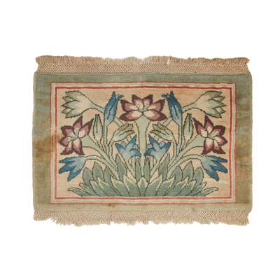 Note: In 1875, Morris & Co. began large-scale production of floor coverings, rugs and carpets, designed to complement an ever-popular ‘Morris’ aesthetic in Victorian Britain. A triumph in craftsmanship on an impressive scale, these designs were hailed as some of the finest hand-knotted carpets ever produced in Britain at the time. Morris’ designs were largely inspired by his love of Eastern carpets from Persia Turkey and China, of which he amassed a great deal and used to furnish his own homes, including Red House. Featuring an array of stylised plants and flowers, carefully woven into fields of vibrant colours, the carpets were hugely popular but very expensive to the average customer. As a result, the firm began to manufacture a range of smaller and less costly alternatives to an eager market. Flowerpots were often a feature of these designs, with trailing flowers stemming out from the centre against a cream ground, and a dark blue border. These smaller rugs were frequently used as wall hangings and occasionally placed as bedside rugs in guest bedrooms.