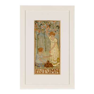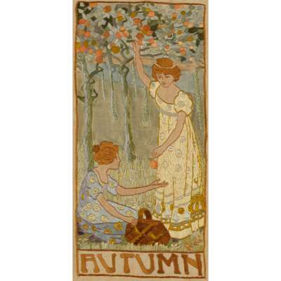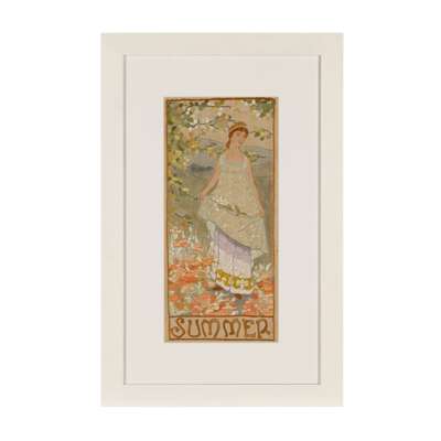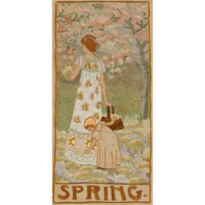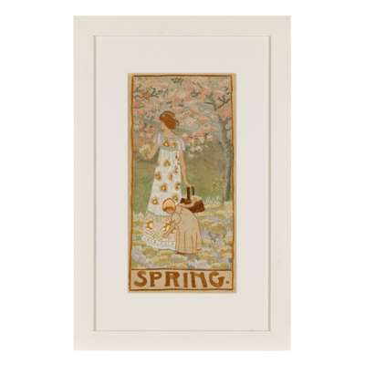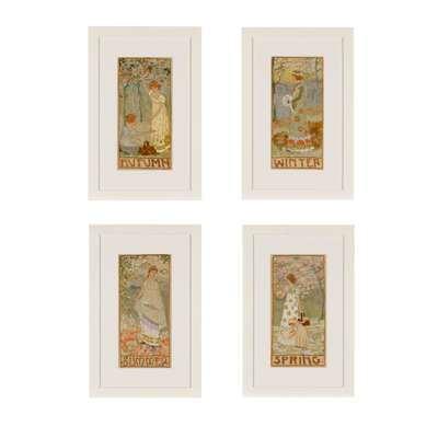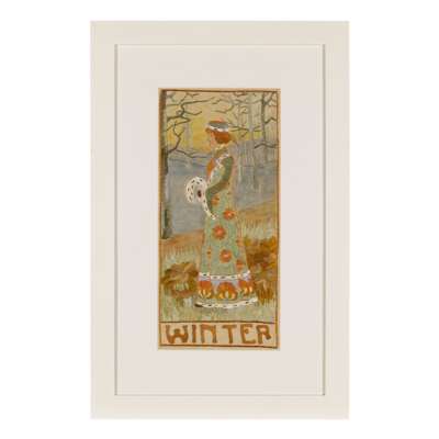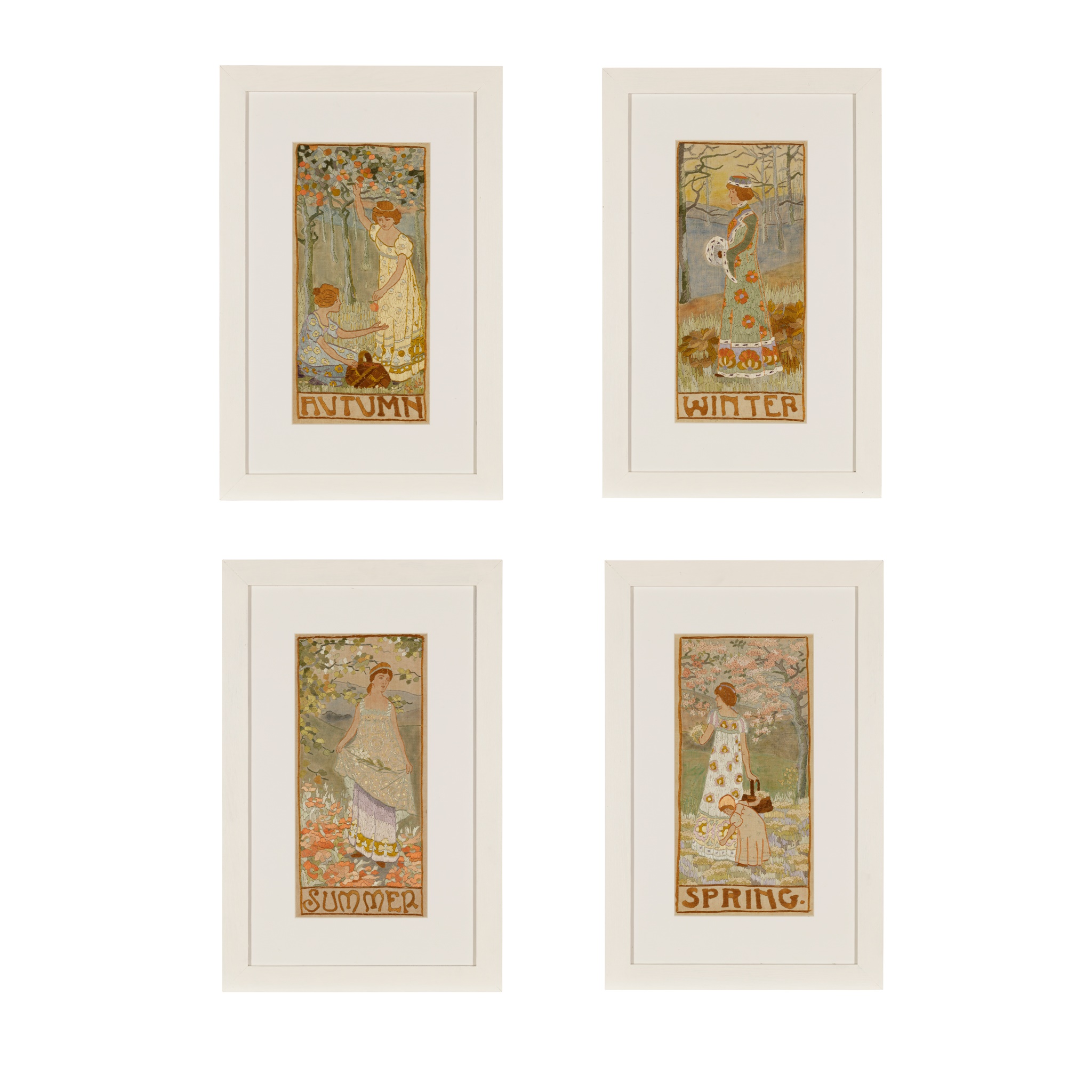 coloured silks and watercolour, reserved on an unbleached linen ground, variously inscribed SPRING; SUMMER; AUTUMN; WINTER, framed