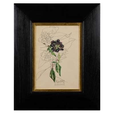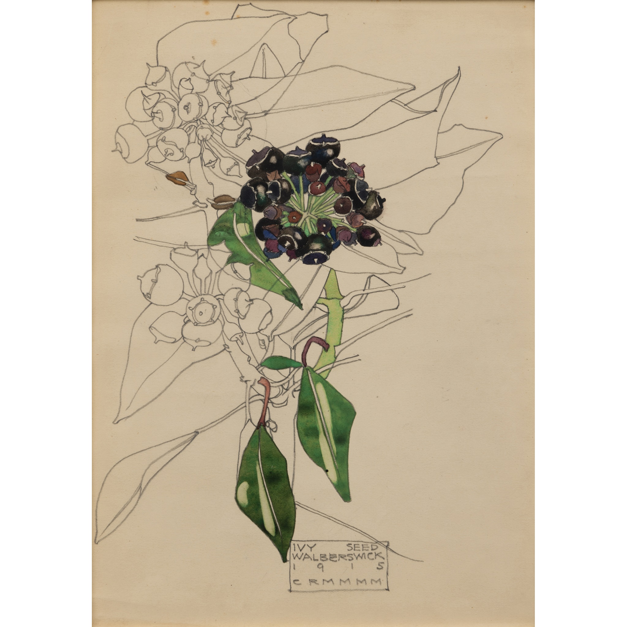 At Walberswick, the studies are decorative depictions, delicately drawn in a naturalistic manner. It is likely that Mackintosh worked with pressed specimens, perhaps picked on his walks to Sturrock’s studio, giving him an already flattened section to work from. In Ivy Seed, the plant is positioned off-centre as the coloured leaves pointing towards the cartouche draw the eye into the complex structure of the branch itself. Mackintosh was clearly meticulous in his approach: connected stems and foliage are interwoven and overlaid in a beautiful display; there is a careful balance of tension, and delicacy in the delineation of the leaves. The vibrancy of colour, subtly deployed across the page, breathes life into the work and helps capture the decorative beauty of his peaceful new environment.