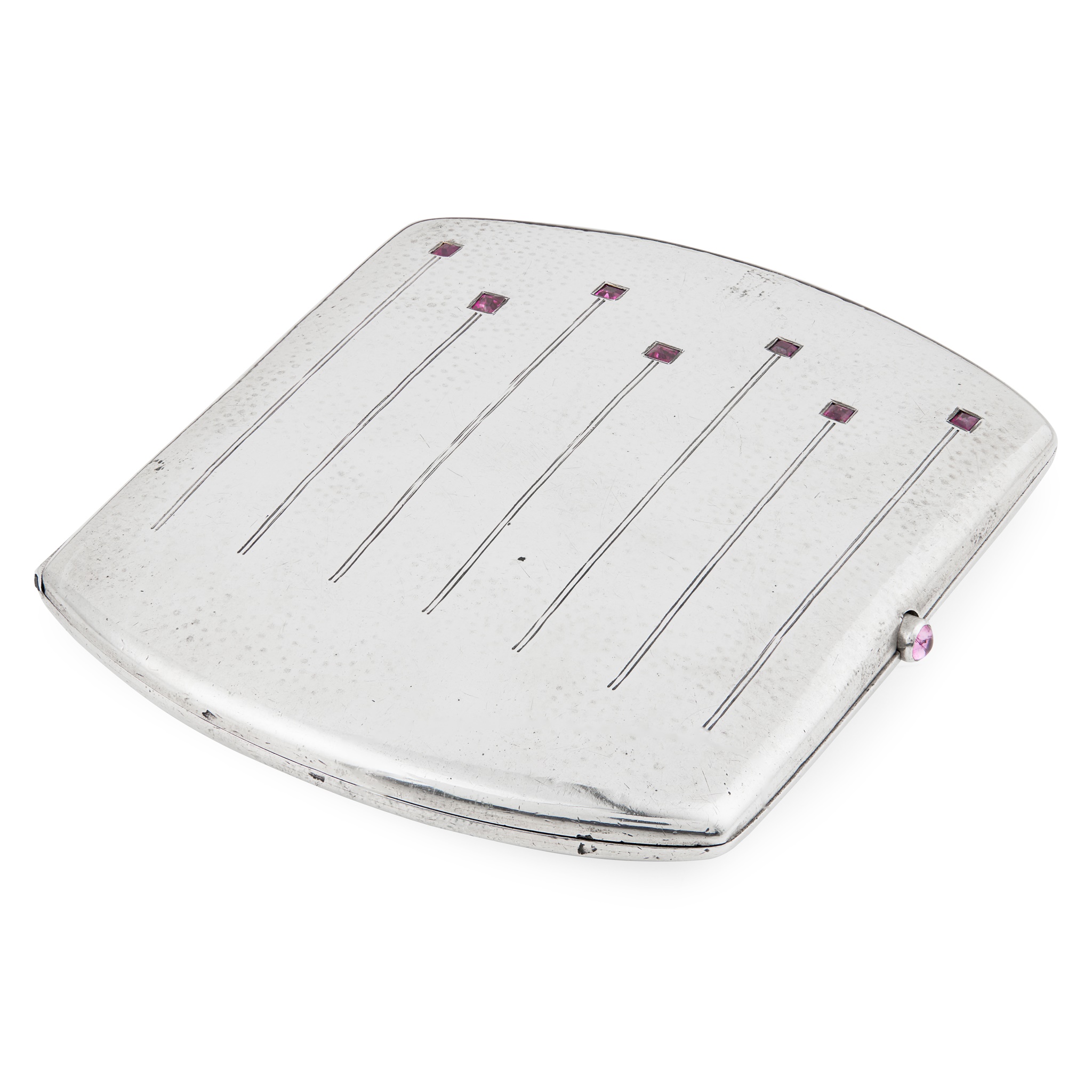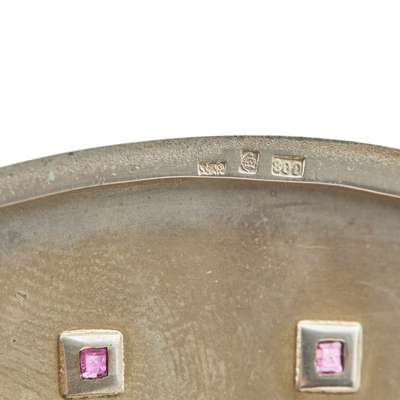 white metal, set with step-cut rubies, stamped maker's marks, 800/ 287, inside engraved LEONARD ROOME