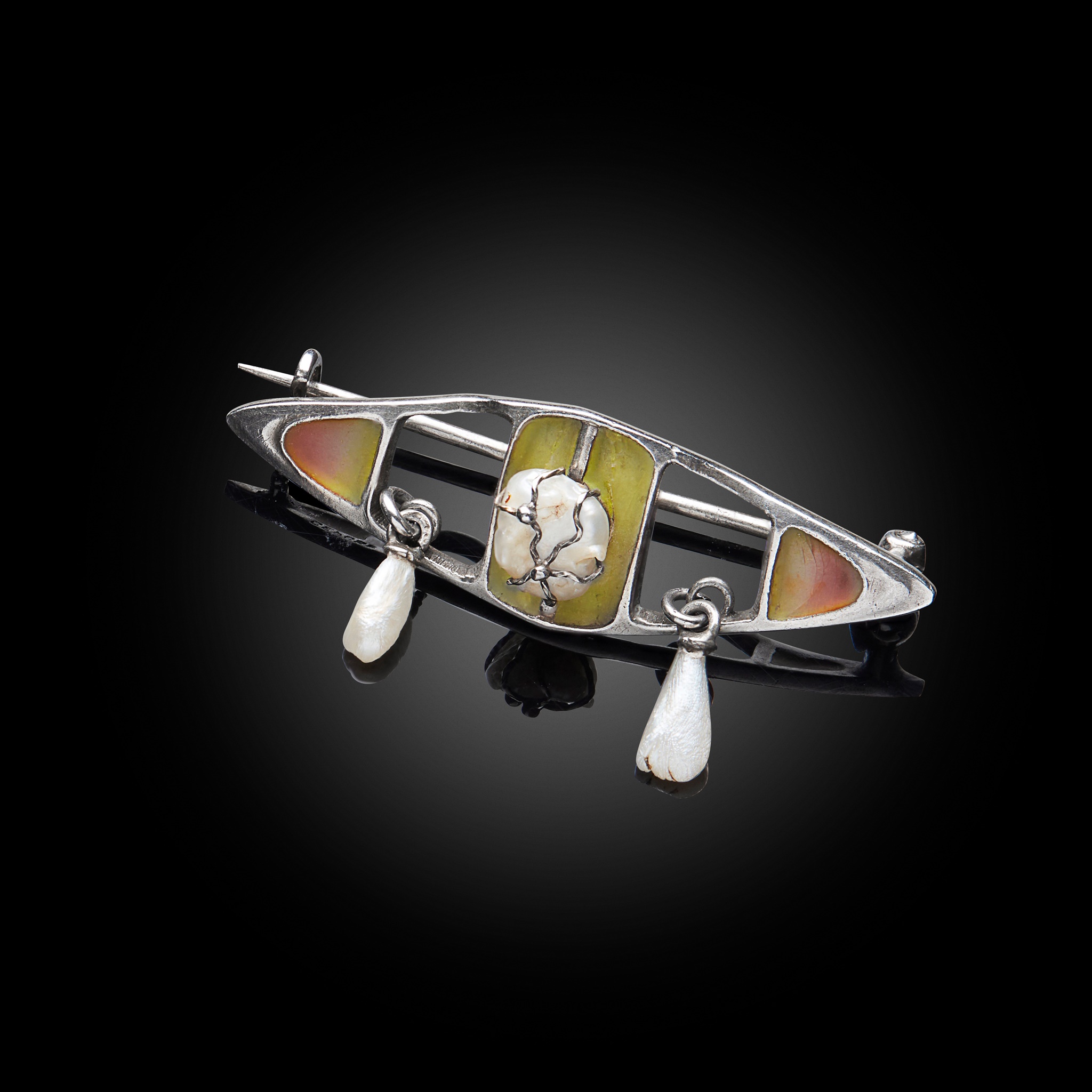 white metal with plique-a-jour enamel and pearls, stamped HL/900/DEPOSE