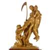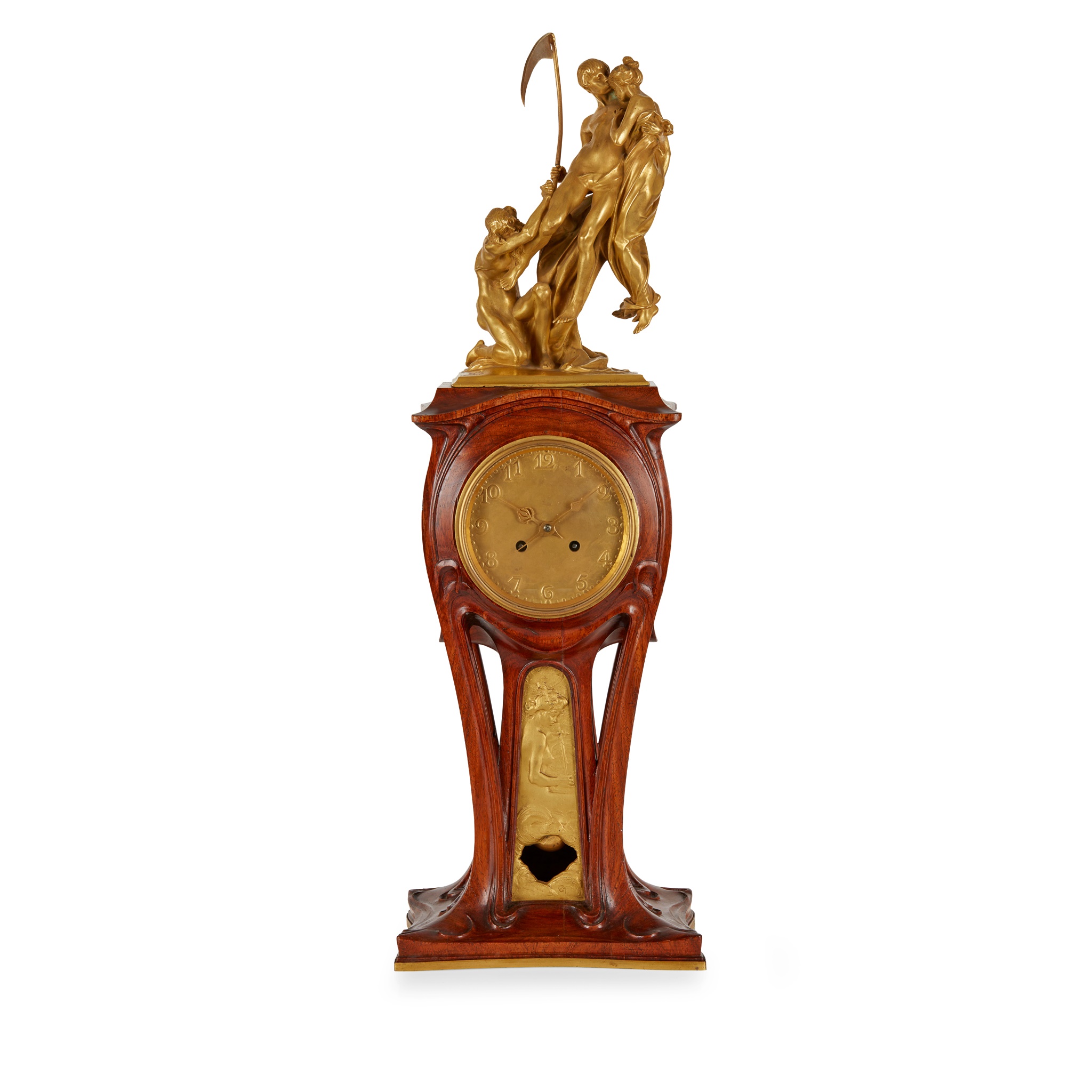 Alexandre Charpentier and Tony Selmersheim belonged to the group Les Cinq (which later changed its name to Les Six and then Les Huit as new members joined) who advertised their ambitions, in an 1898 Paris exhibition, as to integrate art into present-day life and to make everyday items beautiful and meaningful. They, like Emile Gallé, believed in the transformative and redemptive power of the arts to change not just an individual but society more broadly, and even the national economy. Charpentier created the sculptural components of this clock. Originally conceived as a larger figural group it is here employed at half the size. Besides the change in scale, the other difference between the two figural groups is the inclusion of a scythe in this present piece.