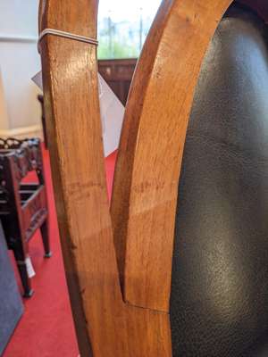 tulipwood, bronze, comprising an EXTENDING DINING TABLE, with four later leaves, 127cm long (closed), 323cm long (open), 74cm high, 124cm deep; a SIDEBOARD CABINET, with marble top and cast bronze handles, 172cm wide, 165cm high, 49cm deep; and SEVEN DINING CHAIRS, each with later close-nailed leather upholstery, 44cm wide, 91cm high, 37cm deep