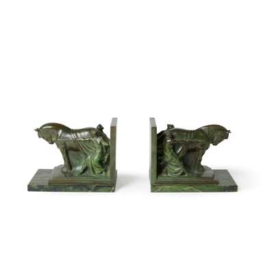 Note: The Art Deco headquarters for the Unilever Group, Unilever House was built in 1930-31 to a design by J. Lomax-Simpson with Sir John Burnet and Partners. The building is noted for its monumental facade, mounted with a large pair of statues by Sir William Reid Dick entitled 'Controlled Energy'. Other artists involved in the project included Eric Gill and Gilbert Ledward. These rare figures by Reid Dick are reductions of the figures on the facade. At the inauguration of Unilever House on 18 July 1932, a pair of small models of these groups in bronze, designed to form book ends were presented to the Lord Mayor and Lord Leverhulme. Another pair, the only other known apart from the current lot, is now in a London private collection.