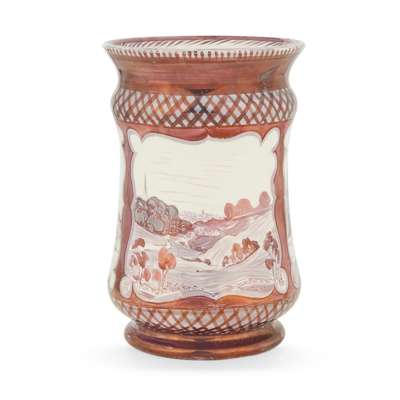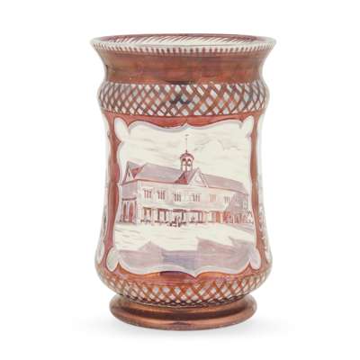 lustre-glazed earthenware, painted with views of Tetbury, Gloucestershire, painted lustre monogram/ 3497, impressed WEDGWOOD/ MADE IN ENGLAND
