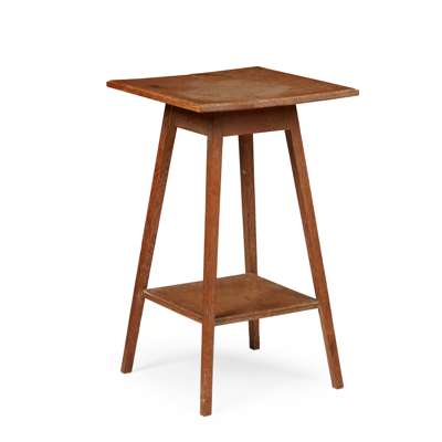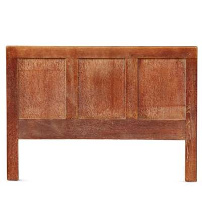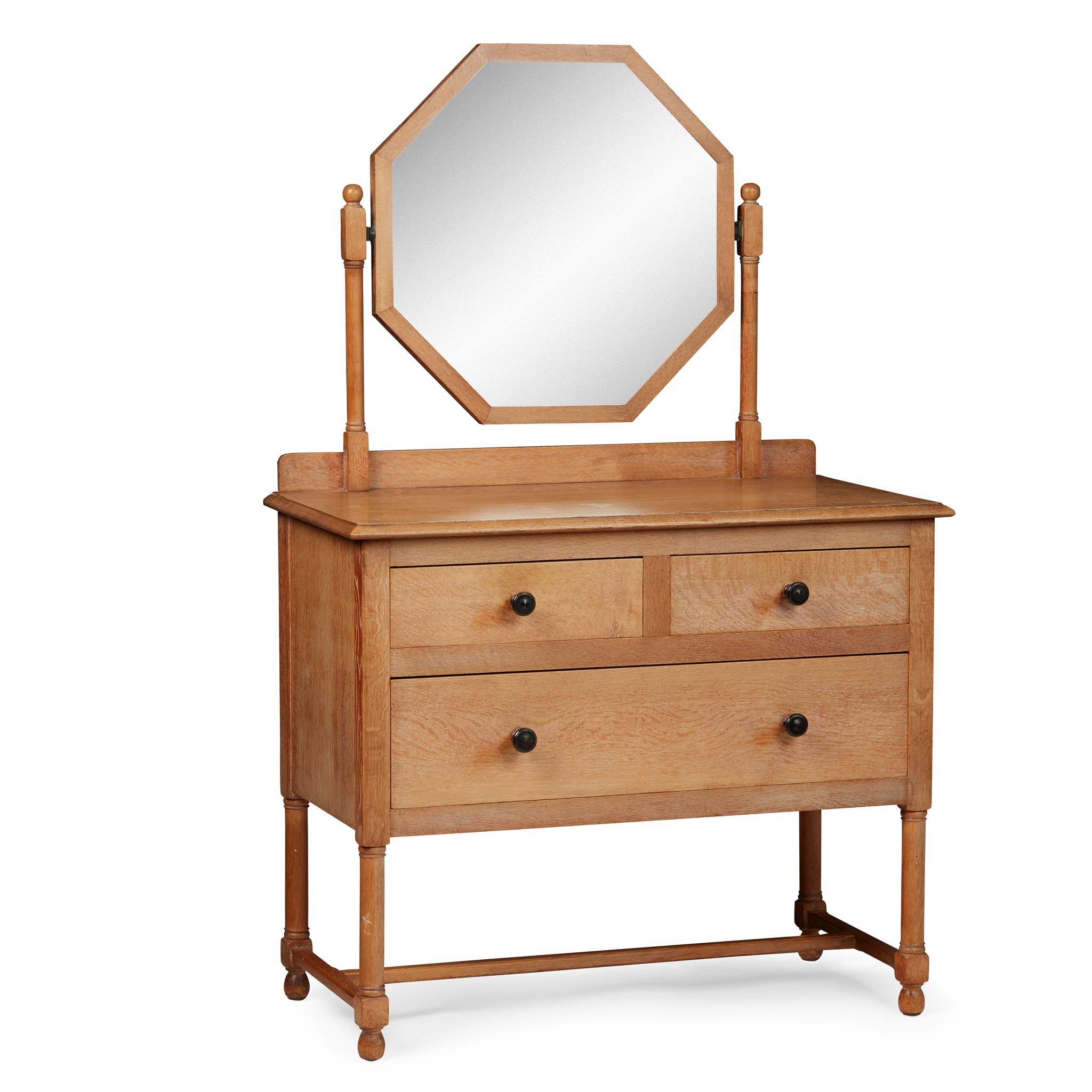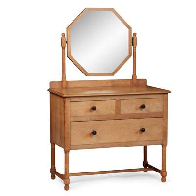 oak, comprising a WARDROBE, oak, 91cm wide, 183cm high, 51cm deep; a DRESSING TABLE, oak with mirrored plate, 92cm wide, 142cm high, 47cm deep; a '952' SIDE CHAIR, with rush seat, 40cm wide, 91cm high, 42.5cm deep; an OCCASIONAL TABLE, 41cm square, 69cm high; a STOOL, 52cm wide, 61cm high, 28cm deep; and TWO SINGLE BEDS, headboards (including modern divan mattresses and bases) 91cm wide, 105cm high; footboards 91cm wide, 67cm high