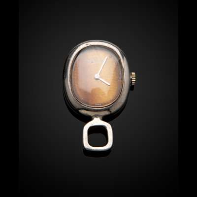 model 150, silver and enamel, stamped maker's marks, 5.8cm x 6cm; together with a GEORG JENSEN TIMEPIECE, silver and enamel, amber dial marked GEORG JENSEN/ SWISS, 3.7cm tall
