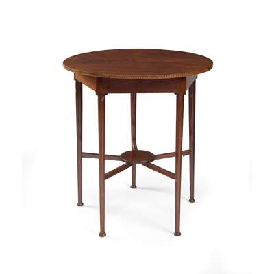 inlaid mahogany, 61cm diameter, 69.5cm high; together with an ARTS & CRAFTS TABLE, in the manner of William Birch, 43cm across, 68cm high
