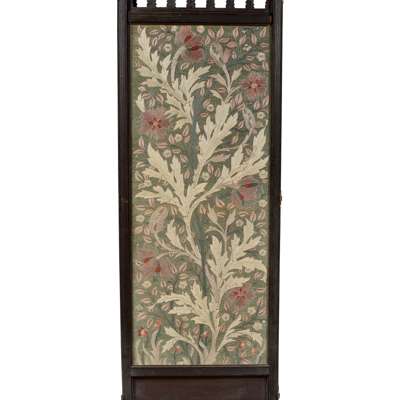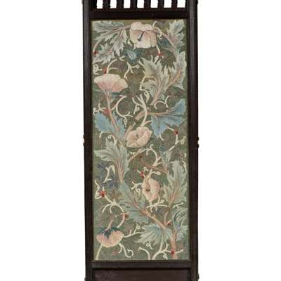 Note: Designs for textiles by William Morris and other designers at Morris & Co. were available to the public as finished embroideries or as kits to complete at home. The kits were an inexpensive way of acquiring work from Morris & Co. These examples were worked from such a kit and mounted in an associated oak screen.