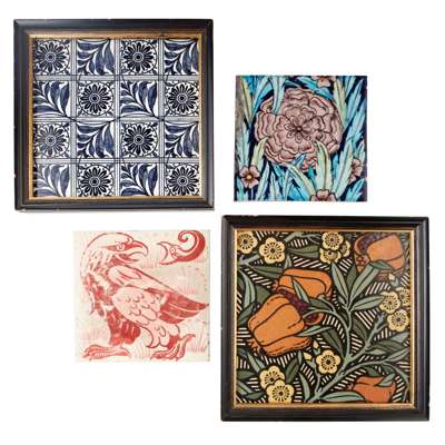 lustre-glazed earthenware, unmarked, 15.2cm square; another WILLIAM DE MORGAN TILE, impressed Sands End mark, 15.3cm square; and TWO FRAMED MAW & CO TILES, each 19.5cm square