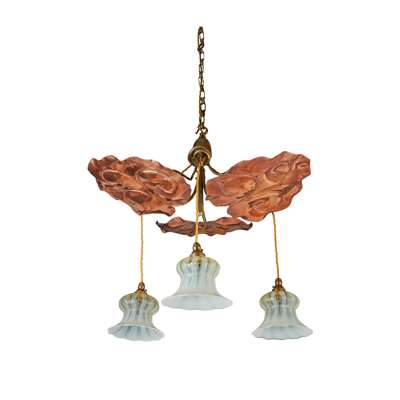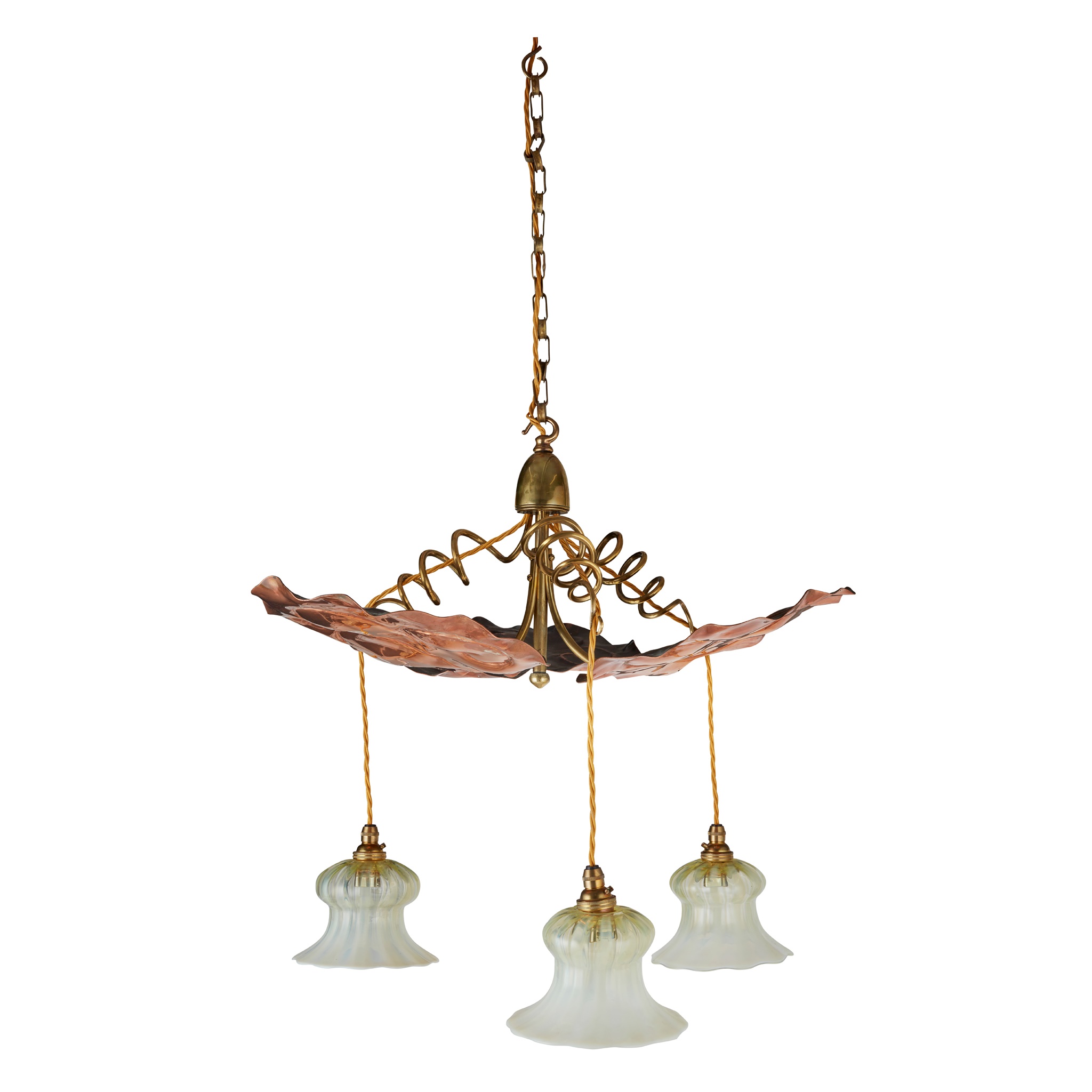 brass, copper, with opalescent glass shades, recently re-wired