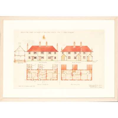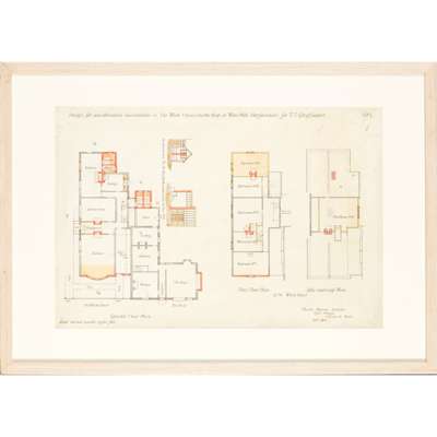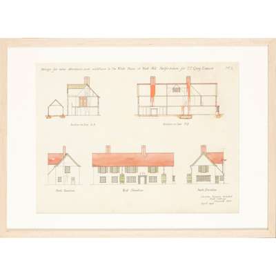 pen and ink, watercolour and graphite, inscribed, to include TWO DESIGNS 'FOR SOME ALTERATIONS AND ADDITIONS TO THE WHITE HOUSE AT WESTMILL HERTFORDSHIRE FOR T.T. GREG ESQ', Nos. 1&2, each further inscribed CHARLES SPOONER ARCHITECT/ EYOT COTTAGE/ CHISWICK MALL/ APRIL 1900; also a DESIGN FOR THREE COTTAGES AT WEST MILL HERTS, dated 1911; and DESIGN FOR THE PRESBYTERY AT LETCHWORTH, HERTS (Presbytery of St Hugh of Lincoln, Letchworth Garden City), No. 3, undated