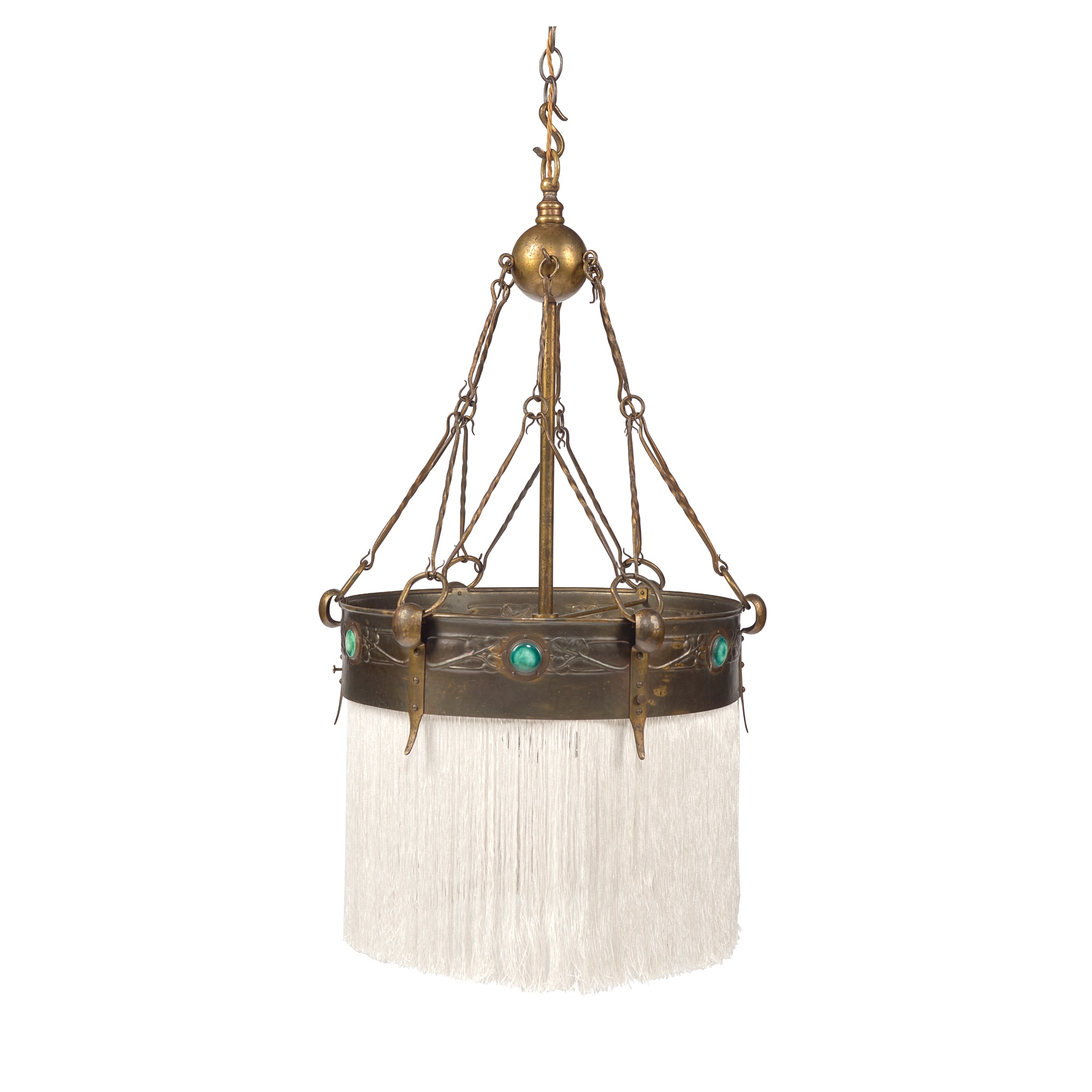 copper and brass, set with glazed ceramic roundels, with fringe shade