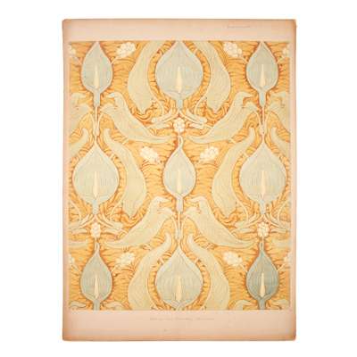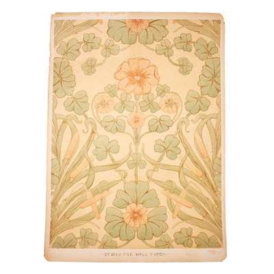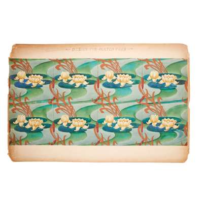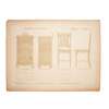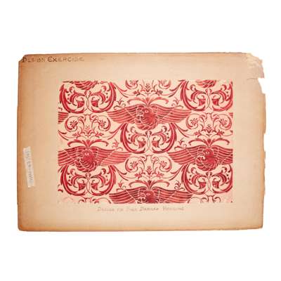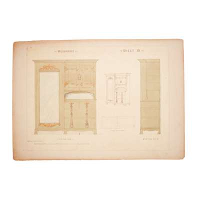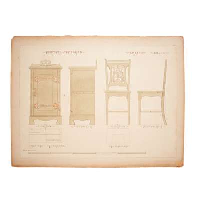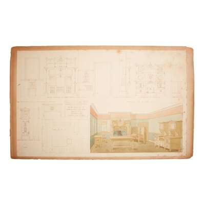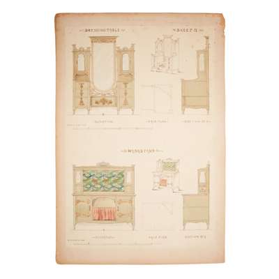 pen and ink, pencil, watercolour on paper, stuck down on board, comprising DESIGN FOR FUMED OAK BEDROOM SUITE, five sheets, inscribed OWEN JONES COMPETITION; DESIGN FOR DINING ROOM FURNITURE FOR COUNTRY HOUSE, one sheet; DESIGN FOR GLAZED TILES; DESIGN FOR PRINTED CRETONNE, inscribed FOR NATIONAL COMPETITION; DESIGN FOR A SILK DAMASK HANGING and DESIGN FOR WALL PAPER, inscribed FOR NATIONAL COMPETITION, each with ESK stamp (Examined South Kensington)