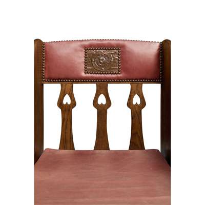 oak, later leather upholstery with loose cushions and solid seats, applied embossed copper plates to the top rails