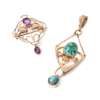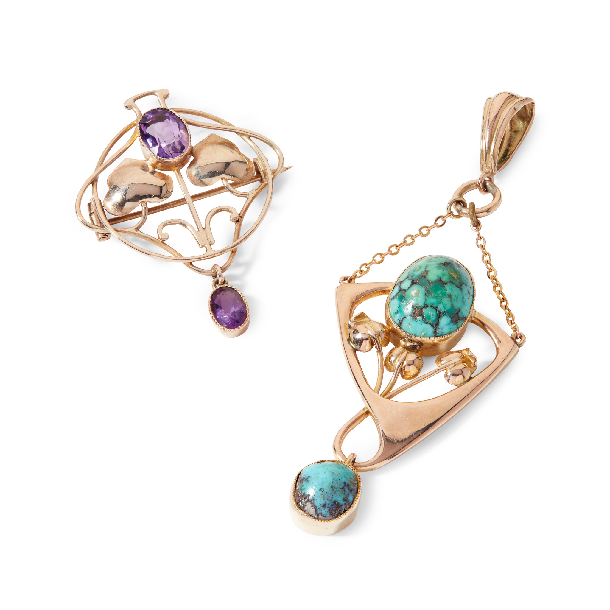 9-carat gold, set with cut amethyst stones, stamped MBCo and 9CT, 3.2cm long; the other 9-carat gold set with turquoise cabochons, stamped 9CT, 6.5cm long, including bale