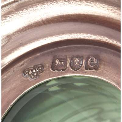 silver, with green glass liners by James Powell & Son, Whitefriars, hallmarked London 1902, stamped GOLDSMITHS & SILVERSMITHS COMPANY LTD/ 112 REGENT ST LONDON