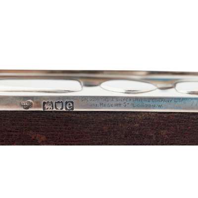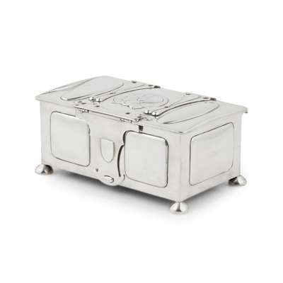 silver, with copper rivets, the interior lined with wood, inscribed under base GOLDSMITHS & SILVERSMITHS COMPANY LTD/ 112 REGENT ST LONDON W, stamped maker's mark, hallmarked London 1900